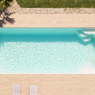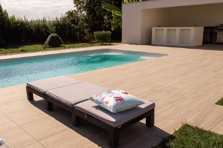 Afin d'épurer au maximum leur espace piscine, nos clients ont choisi de faire leur plage en carrelage façon terrasse bois à fleur du bassin. L’accès de la terrasse depuis la maison jusqu'à l’espace piscine se fait par une passerelle traversant la pelouse qui entoure l’espace piscine.